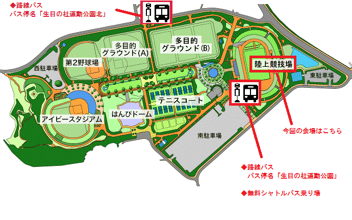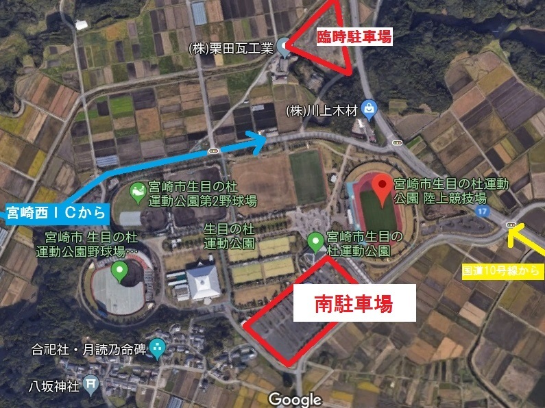Im Ikimenomori Sports Park Leichtathletikstadion in Miyazaki City stehen kostenpflichtige Parkplätze (100 Yen pro Tag) für etwa 1.000 Fahrzeuge zur Verfügung (im gesamten Park).