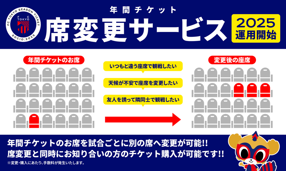 ・Bei Heimspielen im Japan National Stadium wird für SOCIO-Mitglieder mit freier Heimtribüne die "Sitzplatz-0-Yen-Erwerbung" angeboten, jedoch kann das Ticket nach dem 0-Yen-Erwerb nicht für den Sitzplatzwechsel-Service genutzt werden.