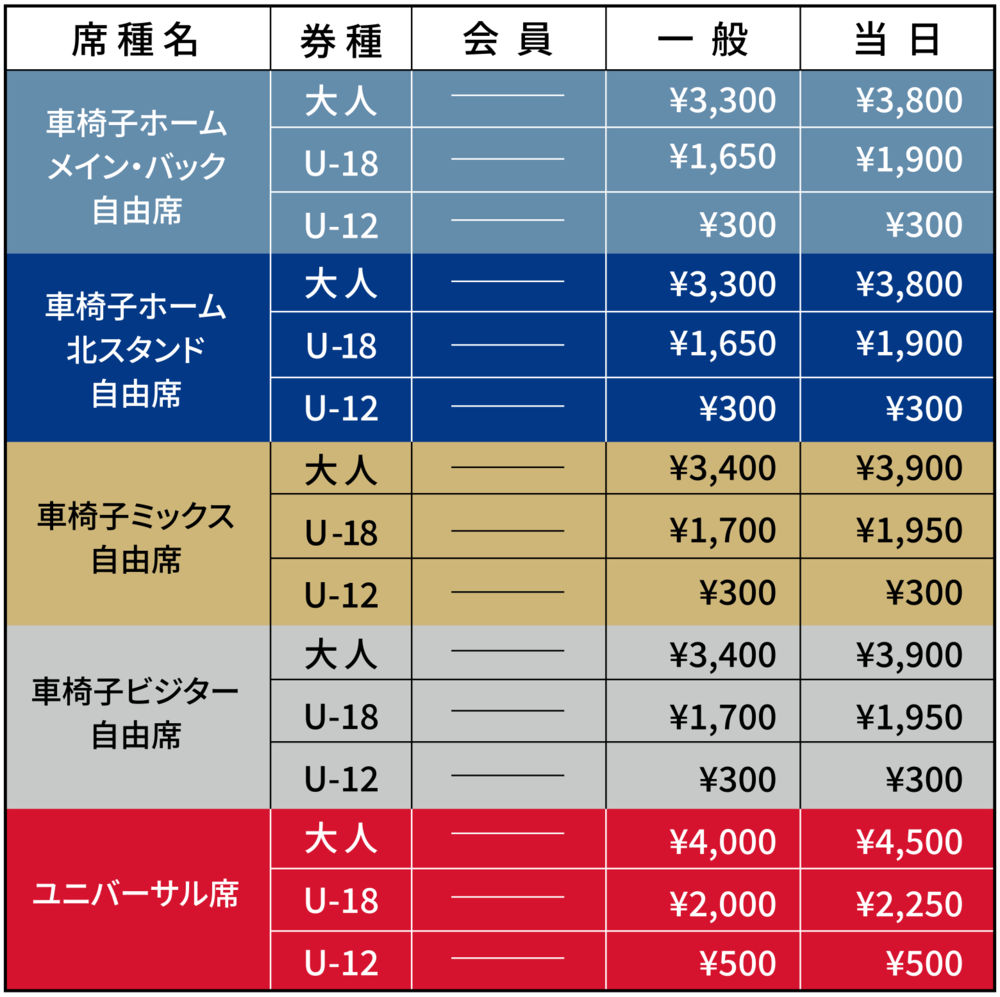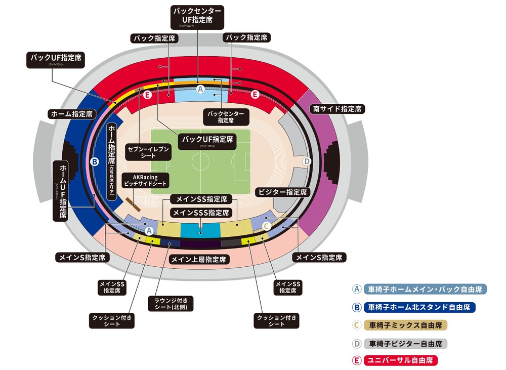 ※Die Sitzplatzarten, bei denen das Tragen von Trikots und Fanartikeln des Gastteams erlaubt ist, sind nur „Rollstuhl-Mix-Freiplätze“ und „Rollstuhl Besuchersitzplätze frei“.