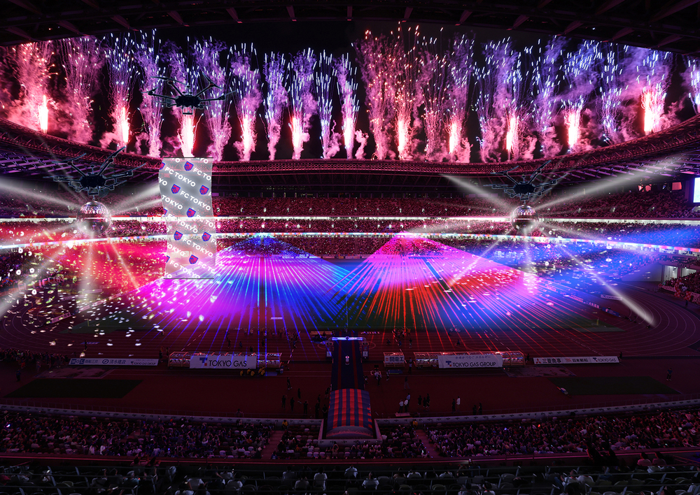 Bei der speziellen National-Darbietung im Spiel gegen Gamba Osaka werden wir neben Spezialeffekt-Feuerwerk vom Dach passend zur Spielerpräsentation und zum Einlaufen der Spieler auch eine Lichtshow mit Moving Lights zeigen sowie eine Premiere im Vereinsgeschichte: Drohnen, die mit Discokugeln und LED-Videowänden ausgestattet sind, werden fliegen.