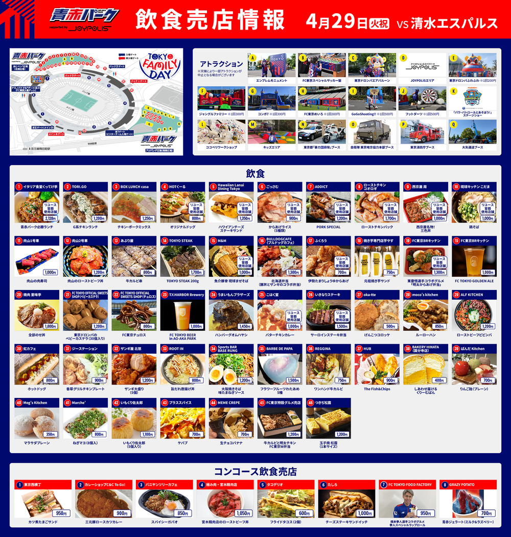 Sa., 29.04.2025 Meiji Yasuda J1 League 13. Spieltag vs Shimizu S-Pulse (Anpfiff 13:05 / Ajinomoto Stadium) – Informationen zu Speisen und Getränken, die im AO-AKA PARK supported by JOYPOLIS (außerhalb des Stadions), im mobilen AO-AKA PARK supported by JOYPOLIS sowie an den Verkaufsständen im Stadioninnenbereich (im Stadion) angeboten werden!