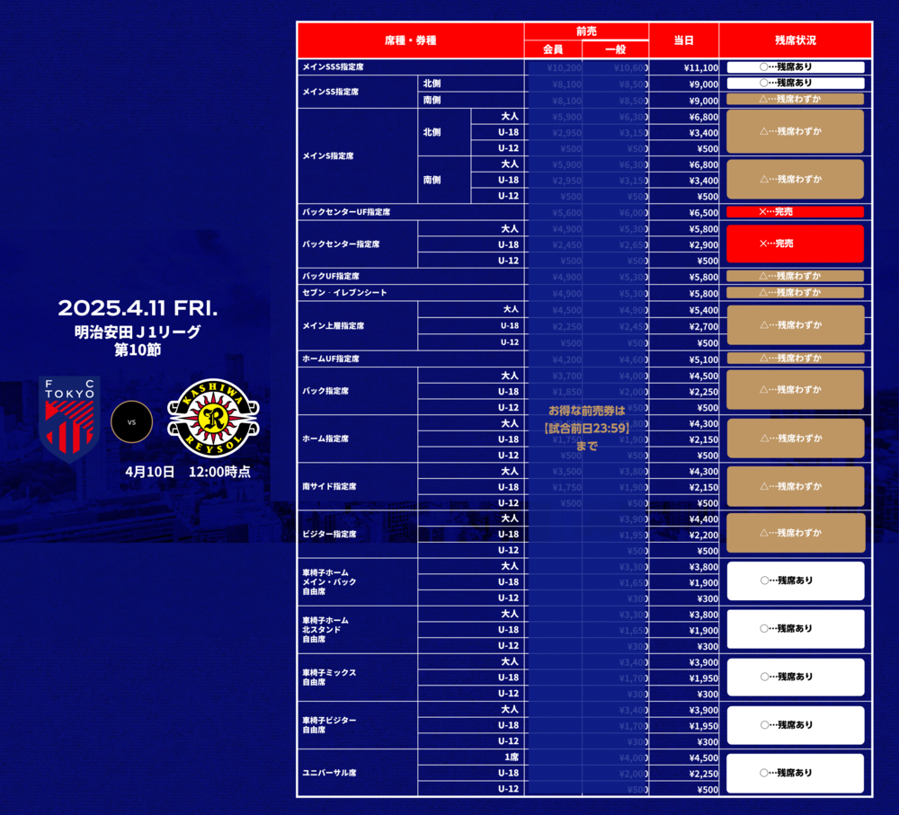 ※ Die Tageskassen im Stadion sind oft überfüllt, bitte kaufen Sie Ihre Tickets über Ticket FC Tokyo (J-League Ticket).