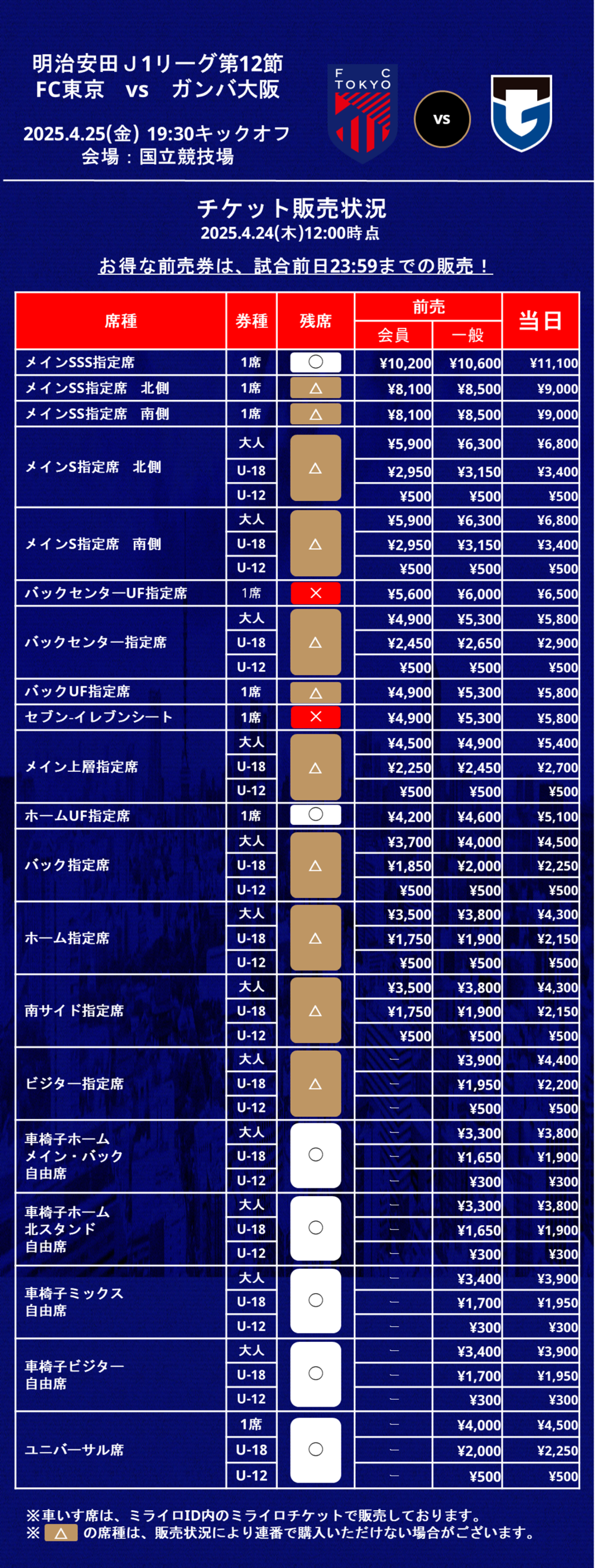 Zum Verkauf von Tageskarten für das Spiel der 12. Runde der J1 League 2025 Meiji Yasuda FC Tokyo vs Gamba Osaka (Anpfiff 19:30 / Ajinomoto Stadium) informieren wir Sie wie folgt.