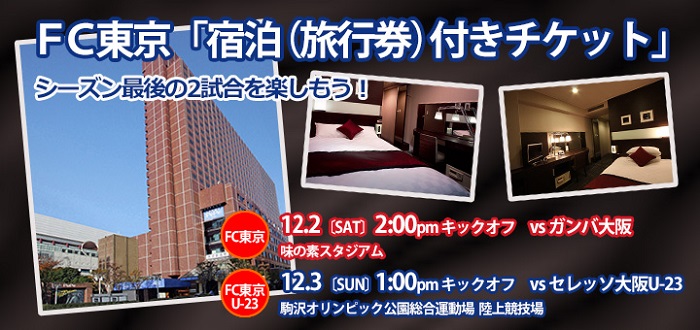 FC Tokyo verkauft in Zusammenarbeit mit Lawson HMV Entertainment Inc. ein "Ticket mit Übernachtung (Reisegutschein)". Dieses Ticket umfasst das Spiel am Sa., 02.12.2017, Meiji Yasuda J1 League, 34. Spieltag, gegen Gamba Osaka (Anpfiff 14:00 / Ajinomoto-Stadion), eine Übernachtung mit Frühstück im Shinjuku Prince Hotel sowie das Spiel am So., 03.12.2017, Meiji Yasuda J3 League, 34. Spieltag, gegen Cerezo Osaka U-23 (Anpfiff 13:00 / Komazawa Olympic Park Stadium).