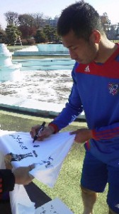 今日は仕事で小平グランドへ行ってきました。ちょうどそこではどうやらTシャツにサインをしている選手が何人も!そうです、12/7(土)仙台戦の『dia obrigado~感謝の日~』に会員限定プレゼント抽選会で当たる選手会とのコラボTシャツです。