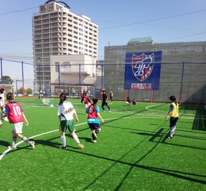 以前に「FC東京パーク府中」で開催した研修会では、会場がフットサルコートであることや「フットサルスクール」の開校もあり、コーチ全員で「フットサル」の基本も学びました。