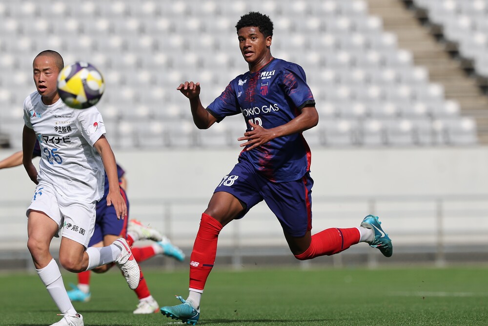 尾谷ディヴァインチネドゥ。2007年5月4日生まれ、18歳。そのフィジカルは圧倒的。191cm、86kgという堂々たる体躯を生かし、最前線でターゲットになったかと思えば、巧みな動き出しから相手のディフェンスラインの裏に抜け出し、鮮やかにゴールを陥れる。FC東京U-15むさしに在籍していた時から背負ってきた“18番”は、こだわりの強いラッキーナンバーだ。