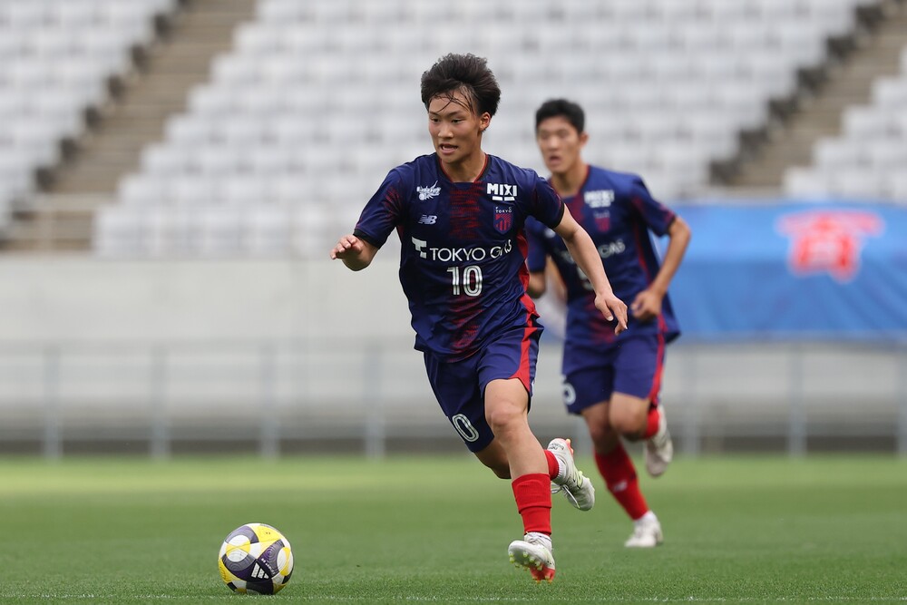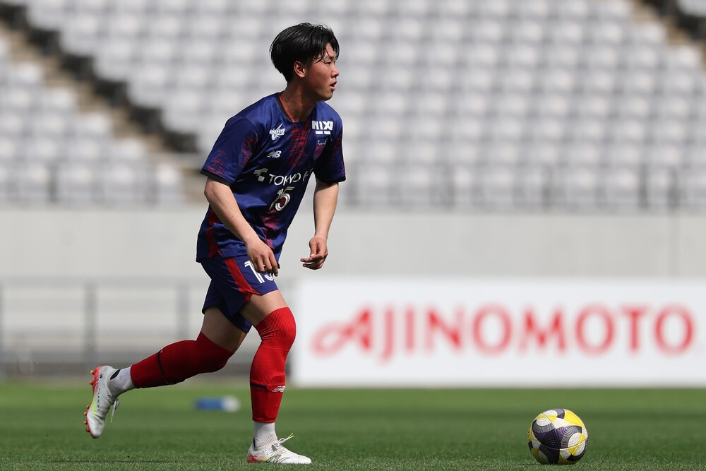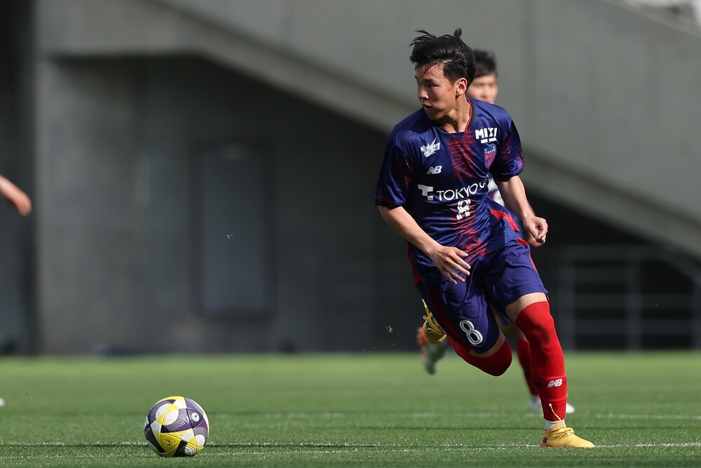 鈴木楓。2007年6月5日生まれ、18歳。まさに生粋の青赤育ち。FC東京U-15むさし時代まではセンターバックが主戦場だったが、U-18に昇格してからはボランチにもトライしたことで、プレーの幅も格段に広がった。長短のパスを蹴り分けられる確かなキック精度と、最終ラインでも恐れずにボールを引き出し、ビルドアップに加わっていく技術の高さと冷静な判断力は、プロでも十分に通用する代物だ。