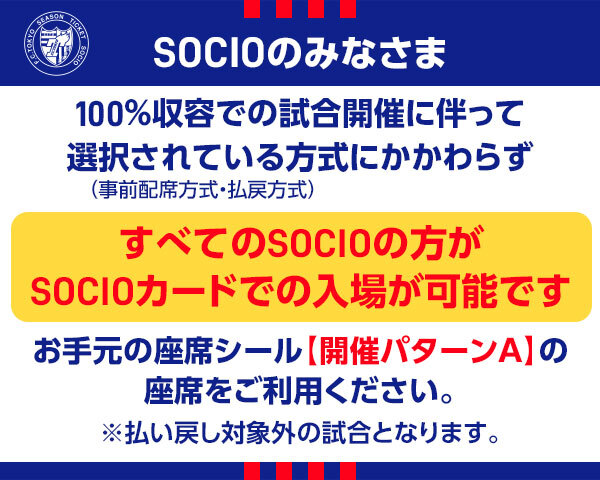 100% 수용 인원으로 경기 개최에 따라, SOCIO 여러분은 선택하신 방식(사전 배석·환불)에 관계없이 모든 SOCIO 여러분이 SOCIO 카드로 입장하실 수 있습니다.