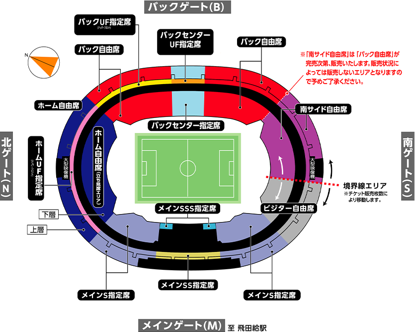 ※비지터 팀의 유니폼·굿즈 착용 및 비지터 팀 응원이 가능한 좌석 종류는 위의 「메인 SS 지정석 남측」, 「메인 S 지정석 남측」, 「비지터 자유석」 3종류이며, 그 외 좌석은 모두 FC 도쿄 응원석입니다.