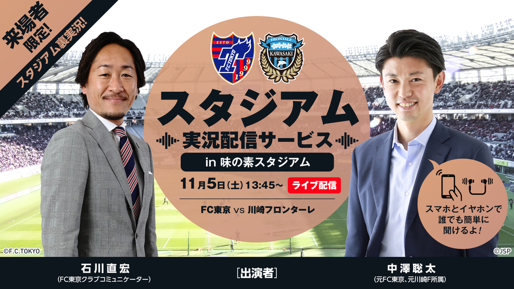 11월 5일(토) 2022 메이지 야스다 생명 J1리그 34라운드 FC 도쿄 vs 가와사키 프론탈레(14:00 킥오프/아지노모토 스타디움)에서 스타디움 내에서 경기 해설을 즐기실 수 있는 '스타디움 중계 서비스 in 아지노모토 스타디움'을 실시합니다.