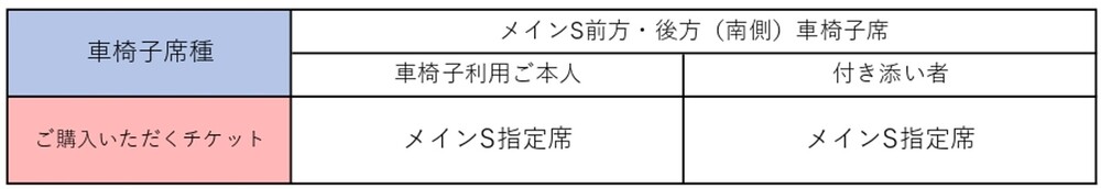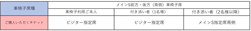 ※메인S 전방(북쪽·남쪽) 휠체어석은 장애인 수첩 소지자를 우선적으로 안내하고 있습니다. 당일 이용 상황에 따라 메인S 후방(북쪽·남쪽) 휠체어석으로 안내될 수 있으니 미리 양해 부탁드립니다.