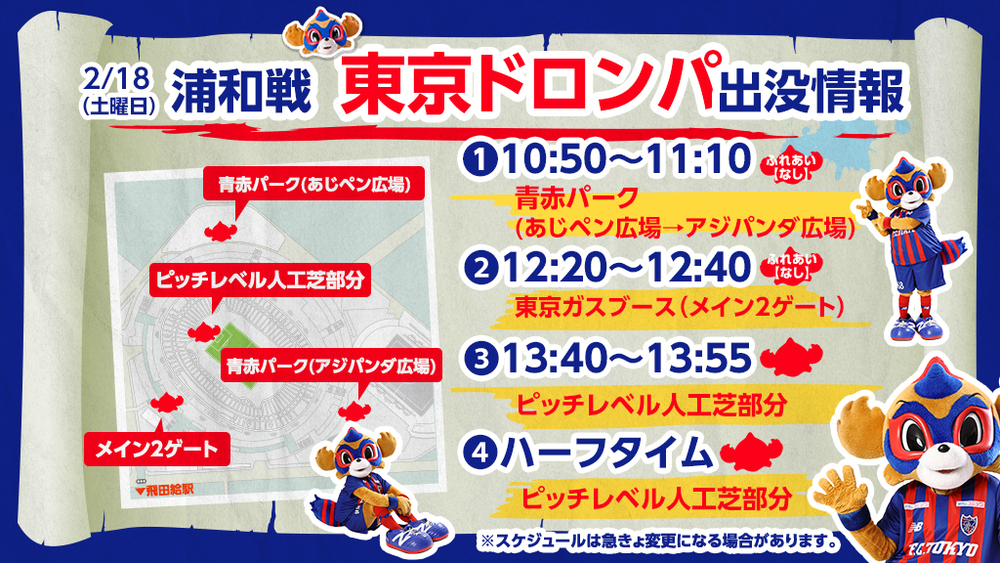 2월 18일(토) 2023 메이지 야스다 생명 J1리그 제1절 vs 우라와 레즈 (14:00 킥오프/아지노모토 스타디움)에서 도쿄 도롱파가 아래와 같이 출현합니다. 꼭 기대해 주세요!