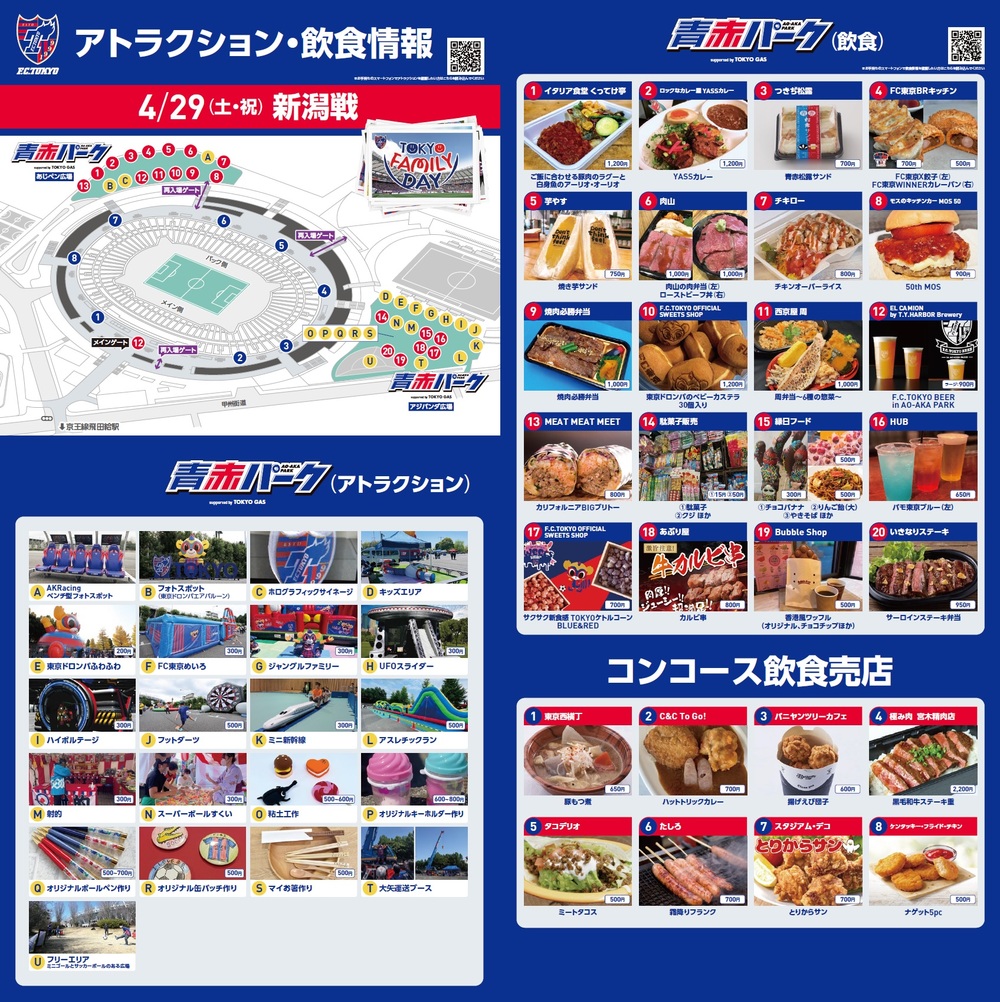 4월 29일(토·공휴일) 알비렉스 니가타전의 아오아카 파크 supported by TOKYO GAS(장외) 및 스타디움 내 콘코스(장내) 매점에서 판매하는 푸드 메뉴입니다.