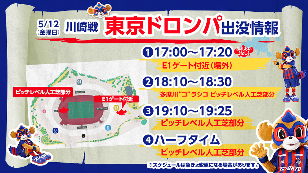 5월 12일(금) 2023 메이지 야스다 생명 J1리그 제13절 vs 가와사키 프론탈레 (19:30 킥오프/국립경기장)에 도쿄 도롱파가 아래와 같이 나타납니다.
