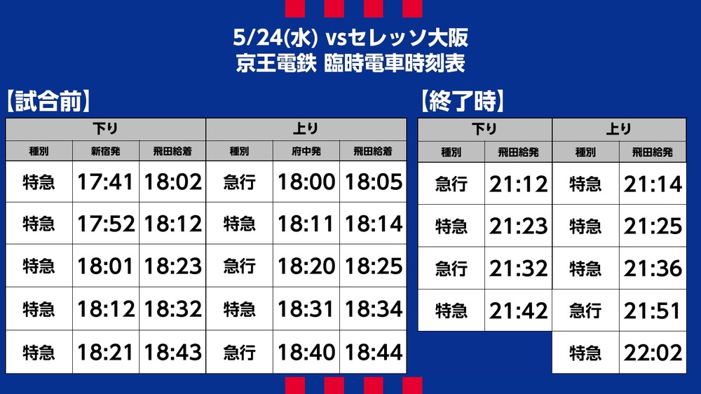 5월 24일(수) 2023 J리그 YBC 르방컵 제5절 vs 세레소 오사카(19:00 킥오프/아지노모토 스타디움)에서 운행되는 임시 교통 접근(철도), 셔틀버스·노선버스에 대해 안내드립니다.