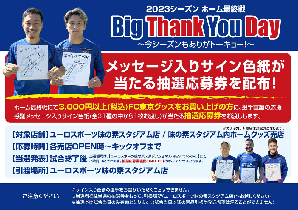 당일 3,000엔 이상(세금 포함) FC 도쿄 굿즈를 구매하신 분께 선수 직필 응원 감사 메시지가 들어간 사인 색지가 당첨되는 추첨회를 실시합니다.
