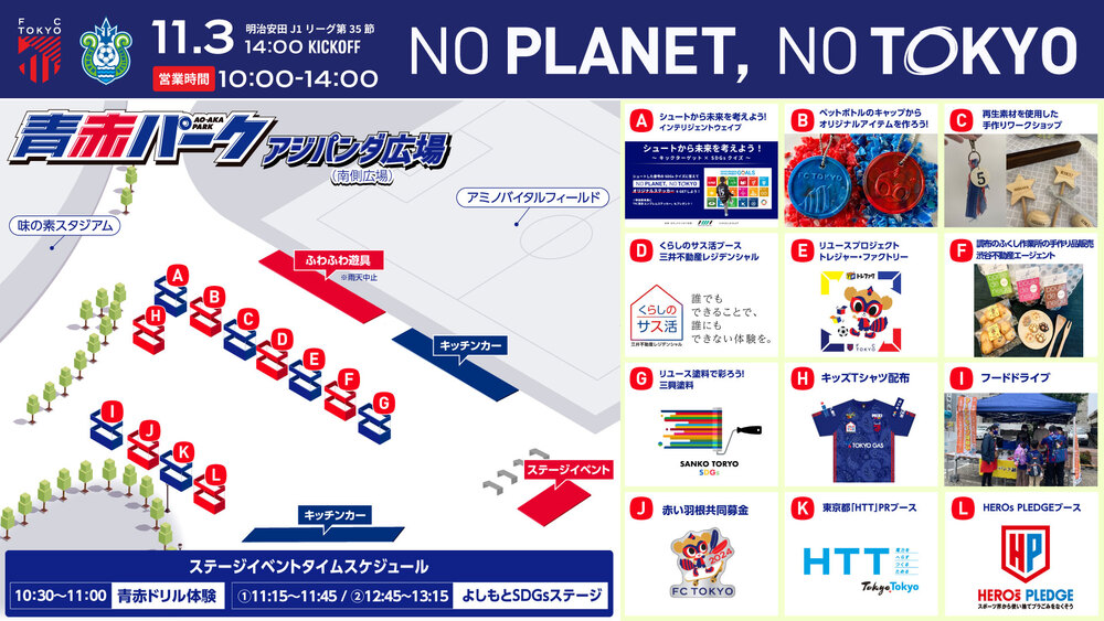 『NO PLANET, NO TOKYO』는 2021년부터 개최해 온 이벤트로, FC 도쿄를 통해 앞으로의 미래를 짊어질 아이들과 함께 사회 및 지역 과제 해결 방법을 생각하는 계기를 만들 수 있는 다양한 이벤트를 실시합니다.