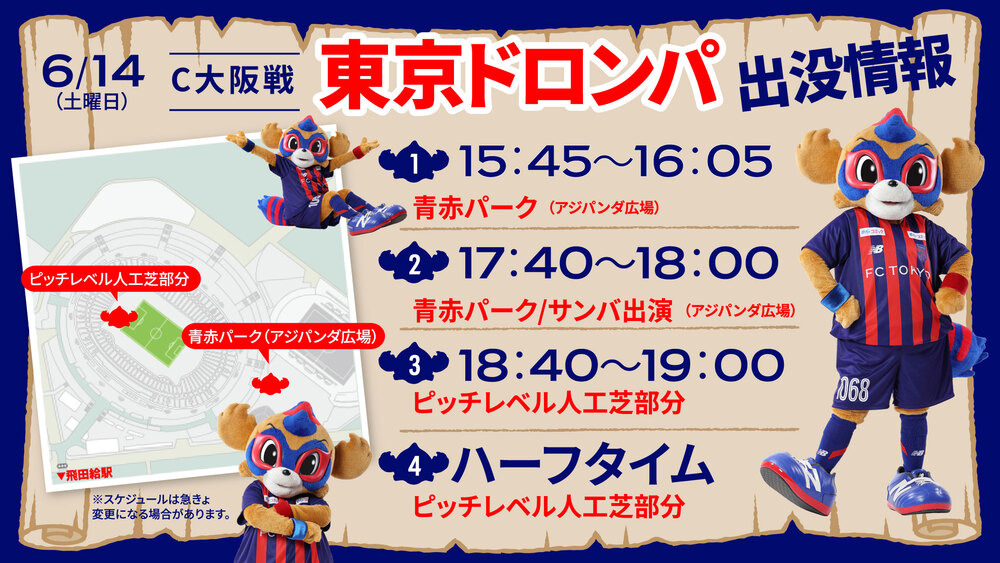 6월 14일(토) 2025 메이지 야스다 J1리그 제20절 vs 세레소 오사카(19:00 킥오프/아지노모토 스타디움)에 도쿄 도롱파가 아래와 같이 나타납니다.