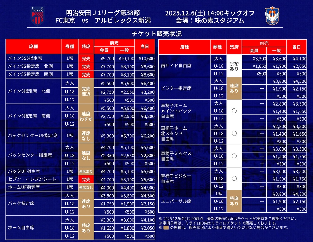2025 메이지 야스다 J1리그 제38절 FC 도쿄 vs 알비렉스 니가타(14:00 킥오프/아지노모토 스타디움) 당일권 판매에 관하여 아래와 같이 안내드립니다.