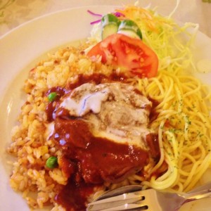 トルコライスとは、一皿に「ピラフ・かつ・スパゲッティ」が盛られた大人のお子様ランチで市内の「ツル茶ん」がおススメ。