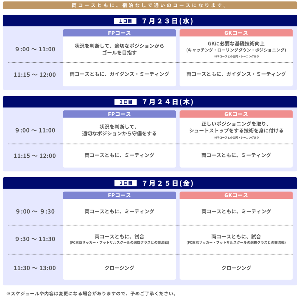 ※最終日は9:00~13:00となります。対面ミーティング後に試合を行い、クロージングを行います。