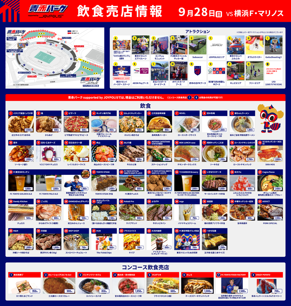 No dia 28 de setembro (Dom) de 2025, na 32ª rodada da Meiji Yasuda J1 League, jogo contra Yokohama F. Marinos (início às 18:00 / Ajinomoto Stadium), informamos sobre as opções de alimentação que estarão disponíveis no AO-AKA PARK supported by JOYPOLIS (fora do estádio), no AO-AKA PARK supported by JOYPOLIS itinerante e nas lojas dentro do concourse do estádio (dentro do estádio).