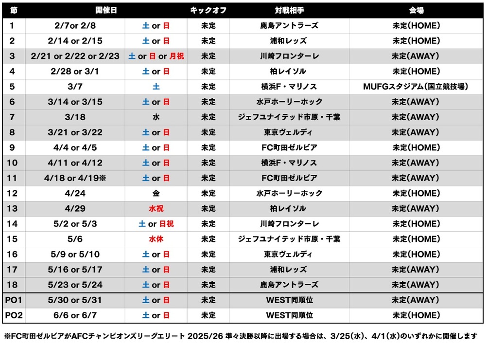 Informamos que foram decididos os confrontos de cada rodada da liga regional e a realização em casa do segundo jogo da fase de playoffs da 'Liga do Centenário Meiji Yasuda J1', que será realizada de fevereiro a junho de 2026.