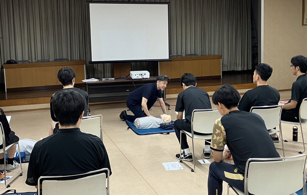 講習会の前半では心肺蘇生法のメカニズムを学び、後半は立教大学スポーツウエルネス学科の