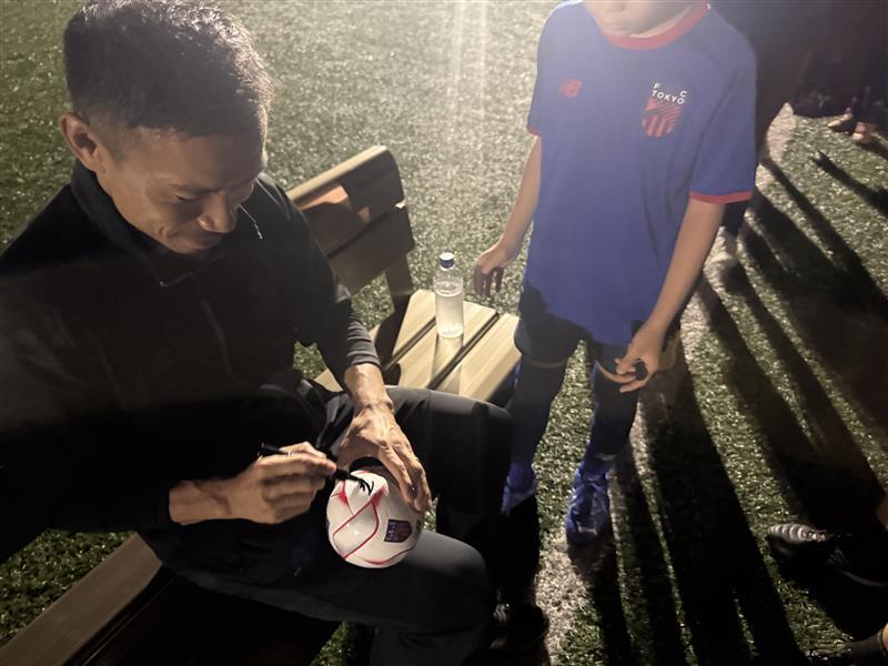 その後はスクール生が用意してきたFC東京グッズ、イタリア時代のユニフォーム、日本代表のユニフォームなどに長友選手が1人1人丁寧にサインを書き、