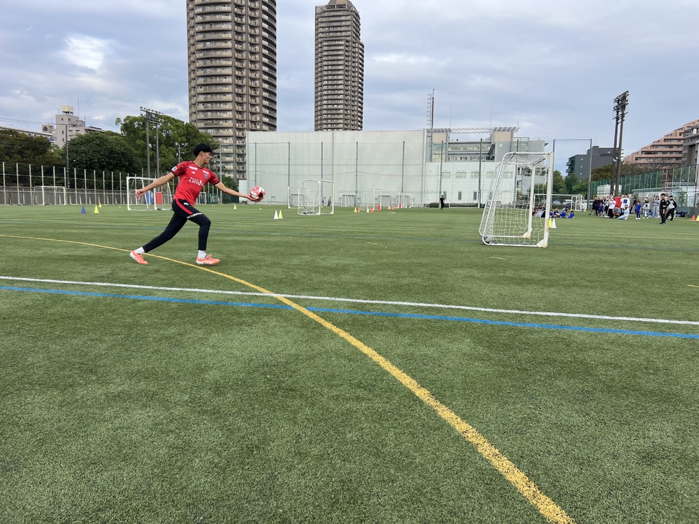 また、ボールを受けてドリブルで相手をかわして、シュートするプレーをスクール生の前で披露しました。