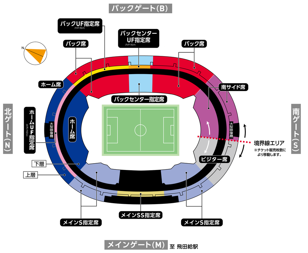 只有“客队席”可以穿着客队商品为客队加油,其他所有席位均为FC东京的加油席。