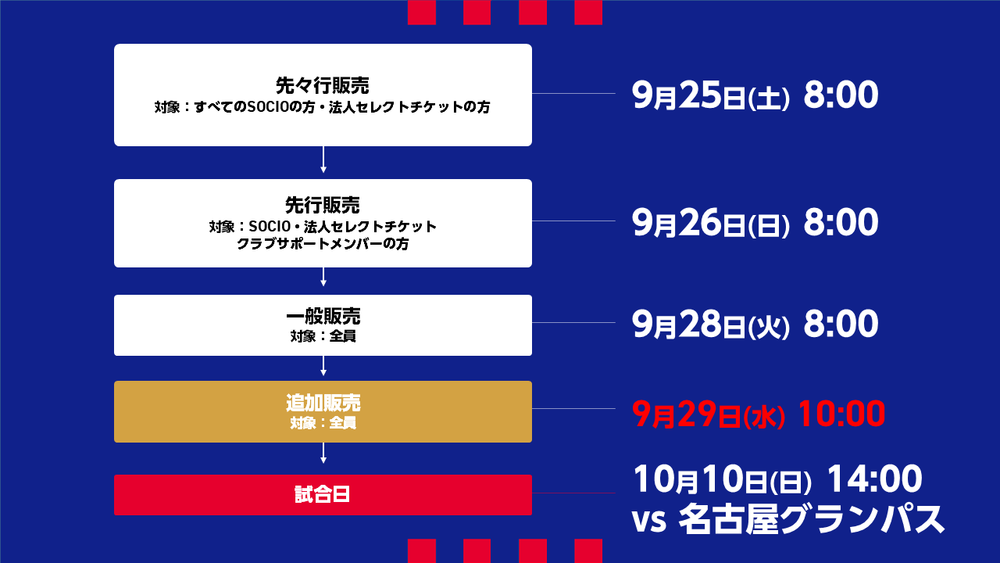 关于本场比赛,门票发售(9/25)时以5,000张为上限开始销售,但现将限制人数调整为10,000人,追加销售未售出的座位。