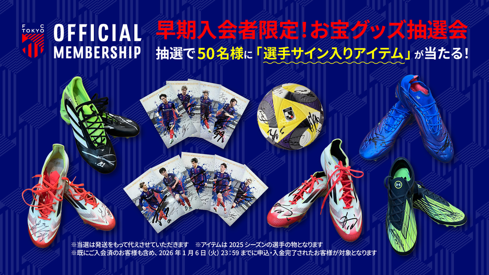 针对2026年1月6日(周二)23:59前加入百年构想联赛+2026/27赛季OFFICIAL MEMBERSHIP的所有会员,举办包含“2025赛季全体球员签名官方比赛用球”及“球员签名球鞋”等共计50名幸运者可获珍贵商品的抽奖会!