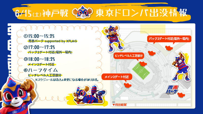 6/15(周六)2019明治安田生命J1聯賽第15節vs Vissel神戶(14:00開球/味之素體育館)中,TOKYO DOROMPA將如以下所示現身。請務必來見「TOKYO DOROMPA」!!敬請期待!