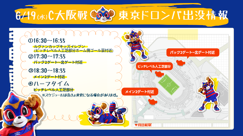 6/19(周三)2019J聯賽YBC雷旺盃附加賽階段第1戰vsCerezo大阪(19:00開球/味之素體育館)將有TOKYO DOROMPA如以下所示登場。請務必來見「TOKYO DOROMPA」!!敬請期待!