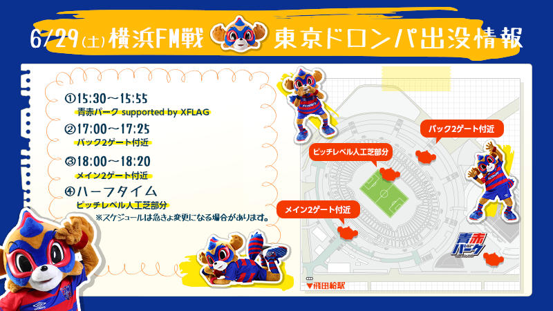 6/29(周六)2019明治安田生命J1聯賽第14節vs橫濱FMarinos(19:00開踢/味之素體育館)將有TOKYO DOROMPA如以下所示登場。請務必來見「TOKYO DOROMPA」!!敬請期待!