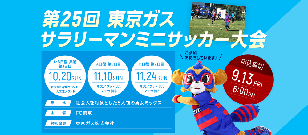 今年也到了「上班族迷你足球大賽」的季節!讓我們與熱愛FC東京的夥伴們一起揮灑汗水,吹散日常的疲憊。這是一場不論足球經驗,大家都能享受的友善比賽。請參閱以下詳細資訊,並透過報名表踴躍報名。我們期待您的參加。