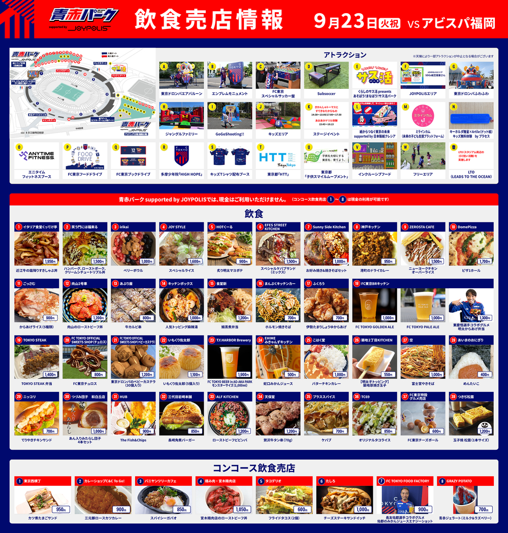 2025年9月23日(週二節假日) 明治安田J1聯賽 第31節 vs Avispa福岡(18:00開球/味之素體育館)的AO-AKA PARK supported by JOYPOLIS (場外)、出張!! AO-AKA PARK supported by JOYPOLIS、體育館內走廊(場內)販賣部販售的飲食資訊通知您。