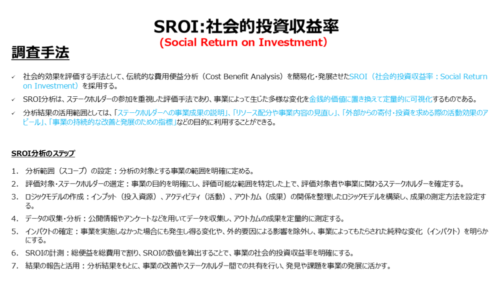 對社會活動投入資金與資源,並實施專案後所產生的社會影響,進行貨幣價值換算並定量評估。此指標基於社會、環境與經濟各面向的成本與效益,評估各種活動所帶來的社會影響,旨在適當評價不僅限於經濟價值的無形價值。