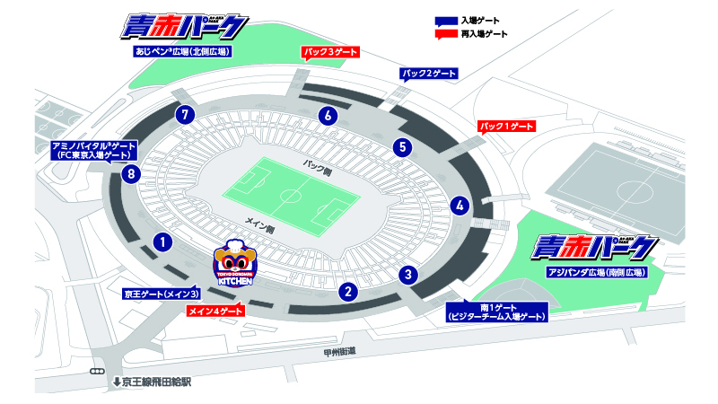 AO-AKA PARK的店鋪將於①主看台外側(行人天橋)、②走廊(體育場內通道)臨時攤位登場!
