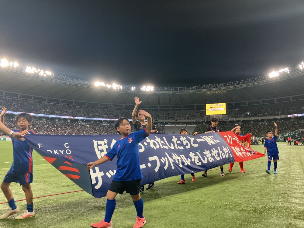 這次也拿著FC東京足球・室內足球學校生招募的橫幅在球場周圍繞行!