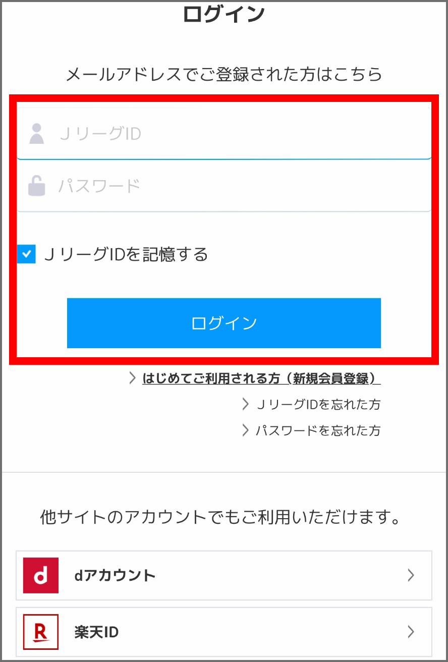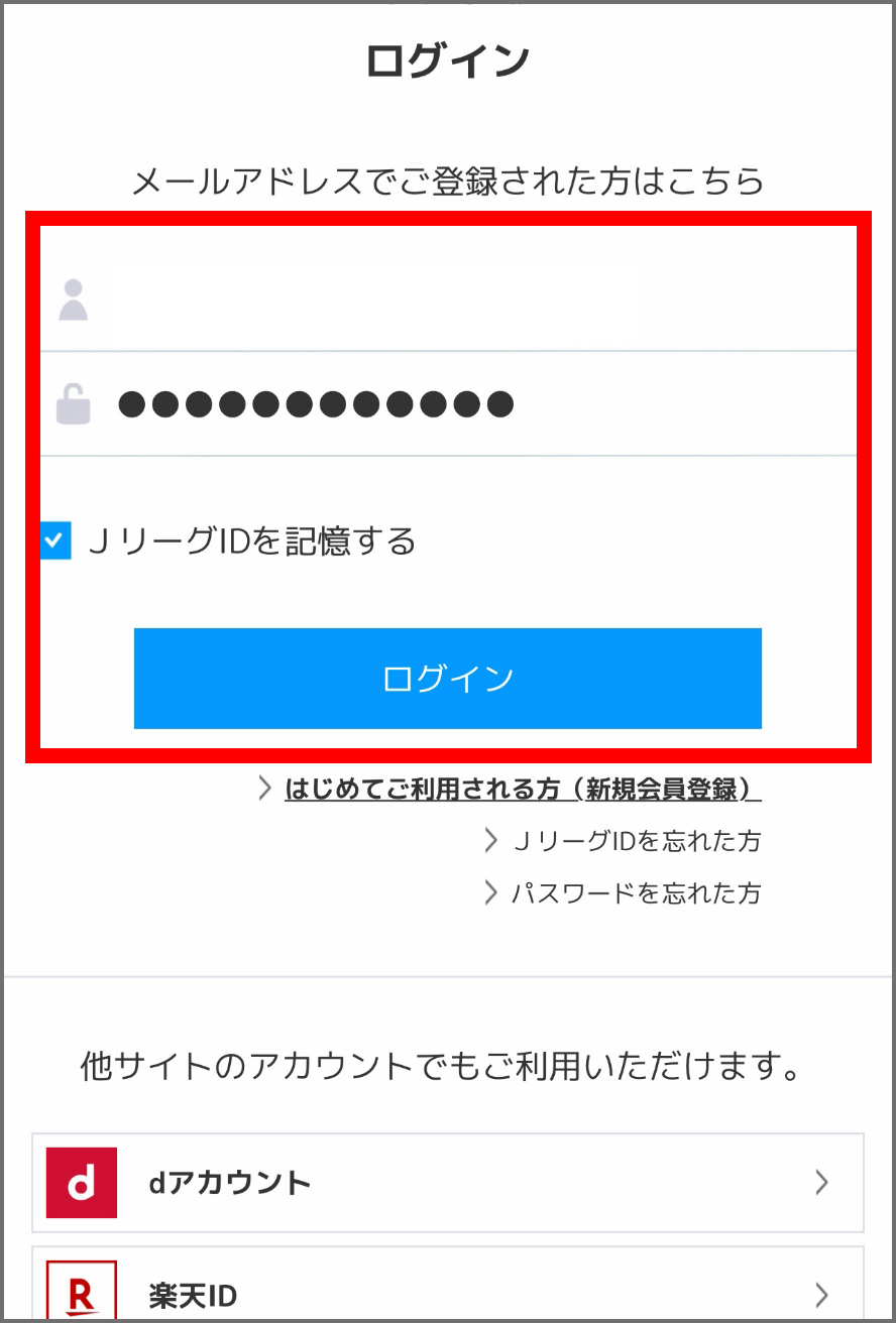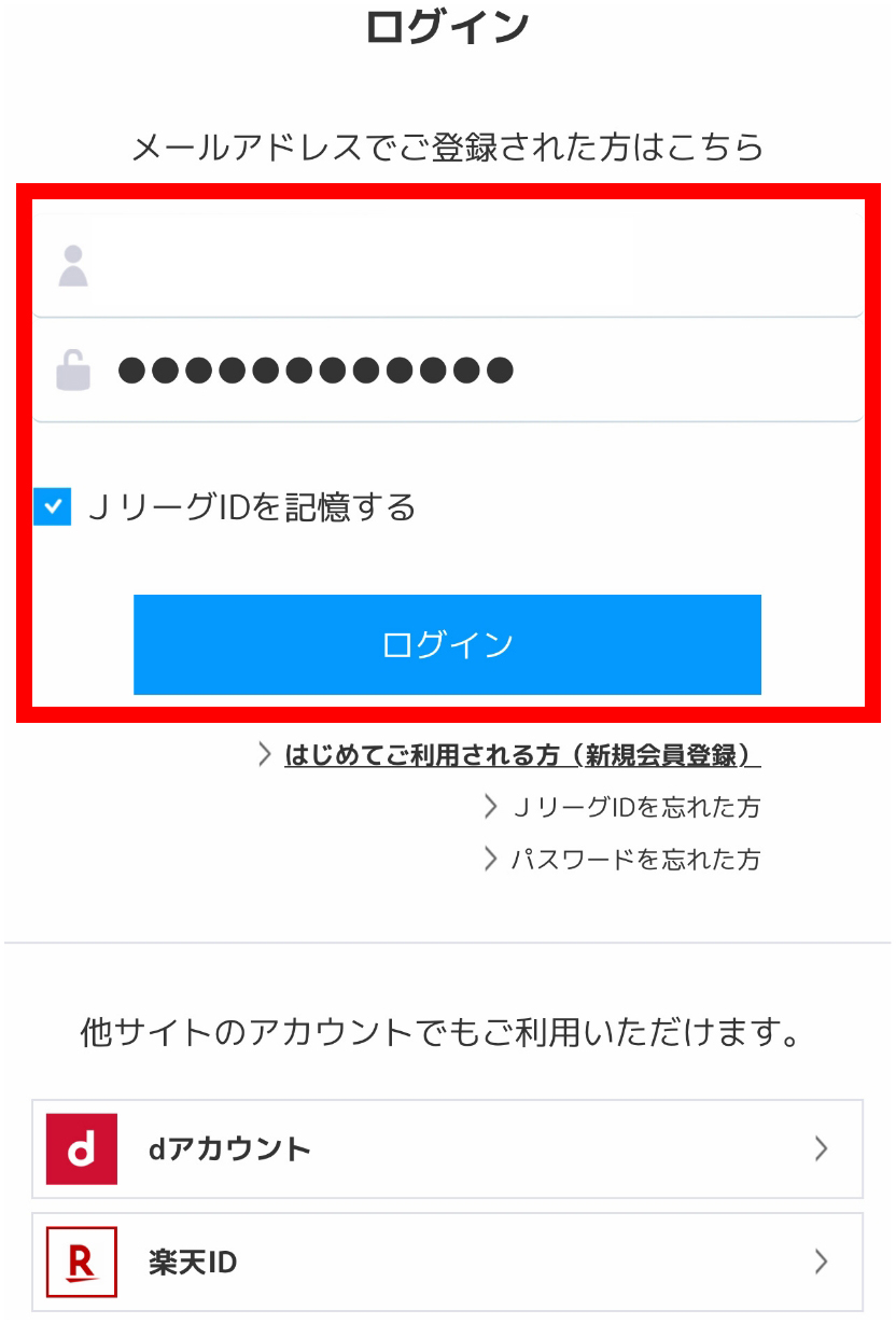 JリーグID取得時のメールアドレスとパスワードを入力しログイン