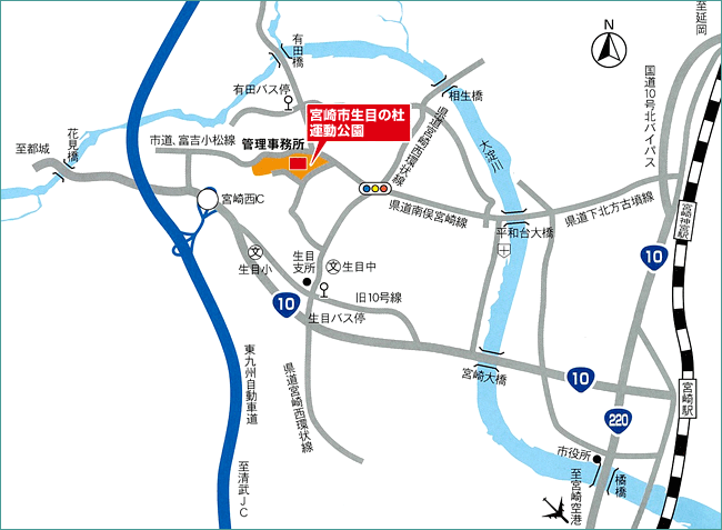 Steigen Sie am Bahnhof Miyazaki in den Bus Richtung Miyazaki Zentralbetriebshof über Komatsudai und Yūraku-en ein → Ausstieg an der Haltestelle „Ikimenomori Sportpark Nord“
