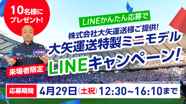 ・Am Sa., 29.04. (Feiertag) beim Spiel FC Tokyo vs Albirex Niigata können alle Besucher teilnehmen, die das offizielle LINE-Konto als Freund registriert haben.