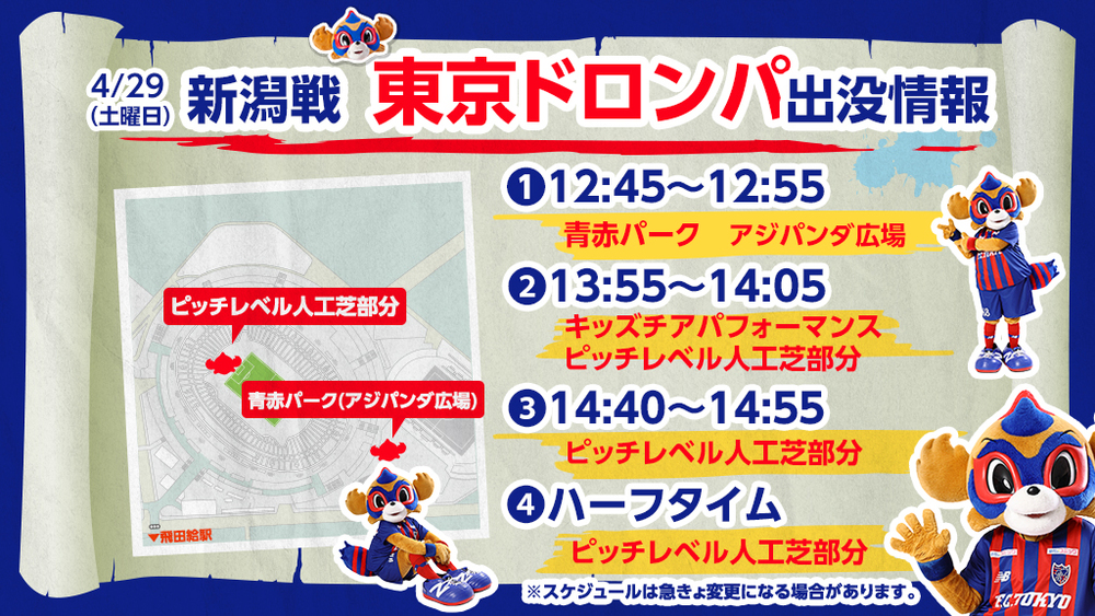 Sa., 29.04. (Feiertag) 2023 Meiji Yasuda J1 League 10. Spieltag vs Albirex Niigata (Anstoß 15:00 / Ajinomoto Stadium) erscheint TOKYO DOROMPA wie folgt.