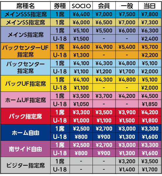 ※ Die Sitzplatzarten, bei denen das Tragen von Trikots und Fanartikeln des Gastteams sowie das Anfeuern des Gastteams erlaubt sind, sind die oben genannten drei Sitzplatzarten „Haupttribüne SS reservierte Sitzplätze Südseite“, „Haupttribüne S reservierte Sitzplätze Südseite“ und „Besucherreservierte Sitzplätze“. Alle anderen Sitzplatzarten sind Unterstützerbereiche von FC Tokyo.