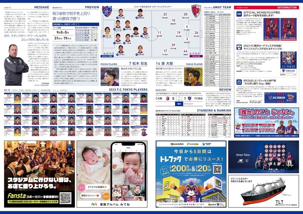 Sa., 12.08.2023 Meiji Yasuda J1 League, 23. Spieltag vs Kyoto Sanga F.C. (Anpfiff 19:00 / Ajinomoto Stadium) Offizielles Matchday-Programm, Informationen wie folgt.