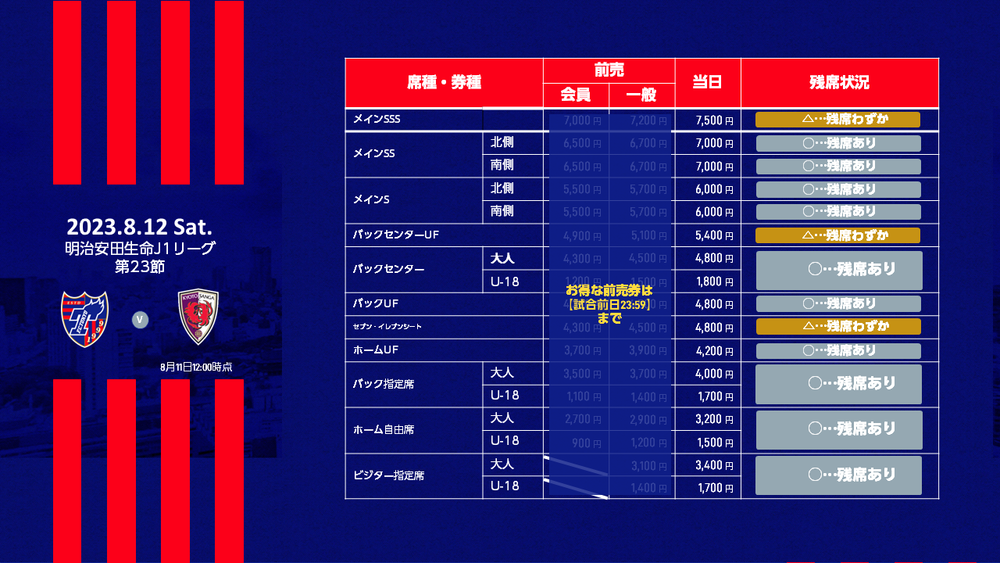 ※Am Spieltag werden keine Tageskarten am Veranstaltungsort verkauft. Der Verkauf erfolgt ausschließlich über Ticket FC Tokyo (J-League Ticket).