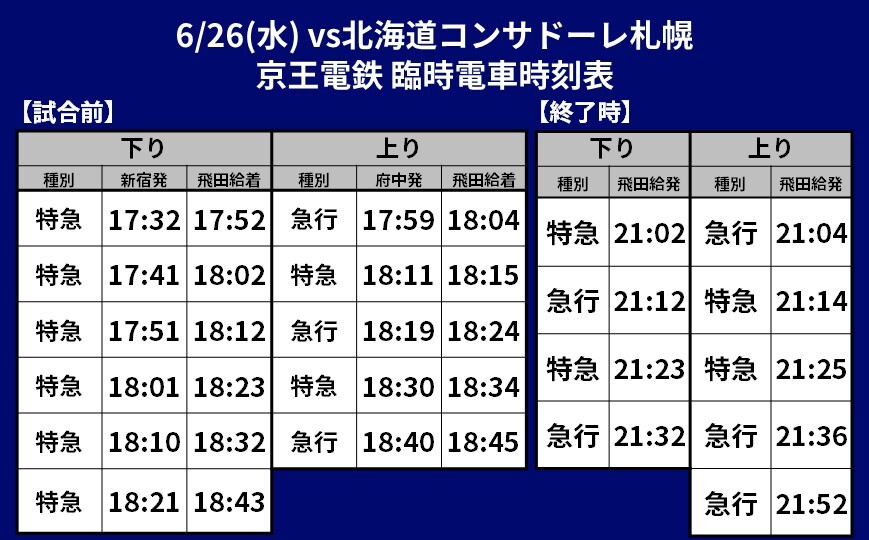 Am Mi., 26.06.2024, im Rahmen der 20. Runde der Meiji Yasuda J1 League gegen Hokkaido Consadole Sapporo (Anpfiff 19:00 / Ajinomoto Stadium) informieren wir über den eingesetzten Sonderverkehr (Schienenverkehr), Shuttlebus- und Linienbusverbindungen.
